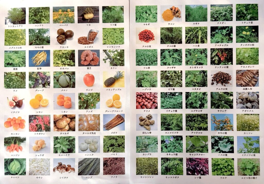 よもぎ(新潟県上越産)・スギナ・ドクダミ・高麗人参・霊芝をはじめ、野菜、果物、海藻類など80種の自然素材が使われています。
